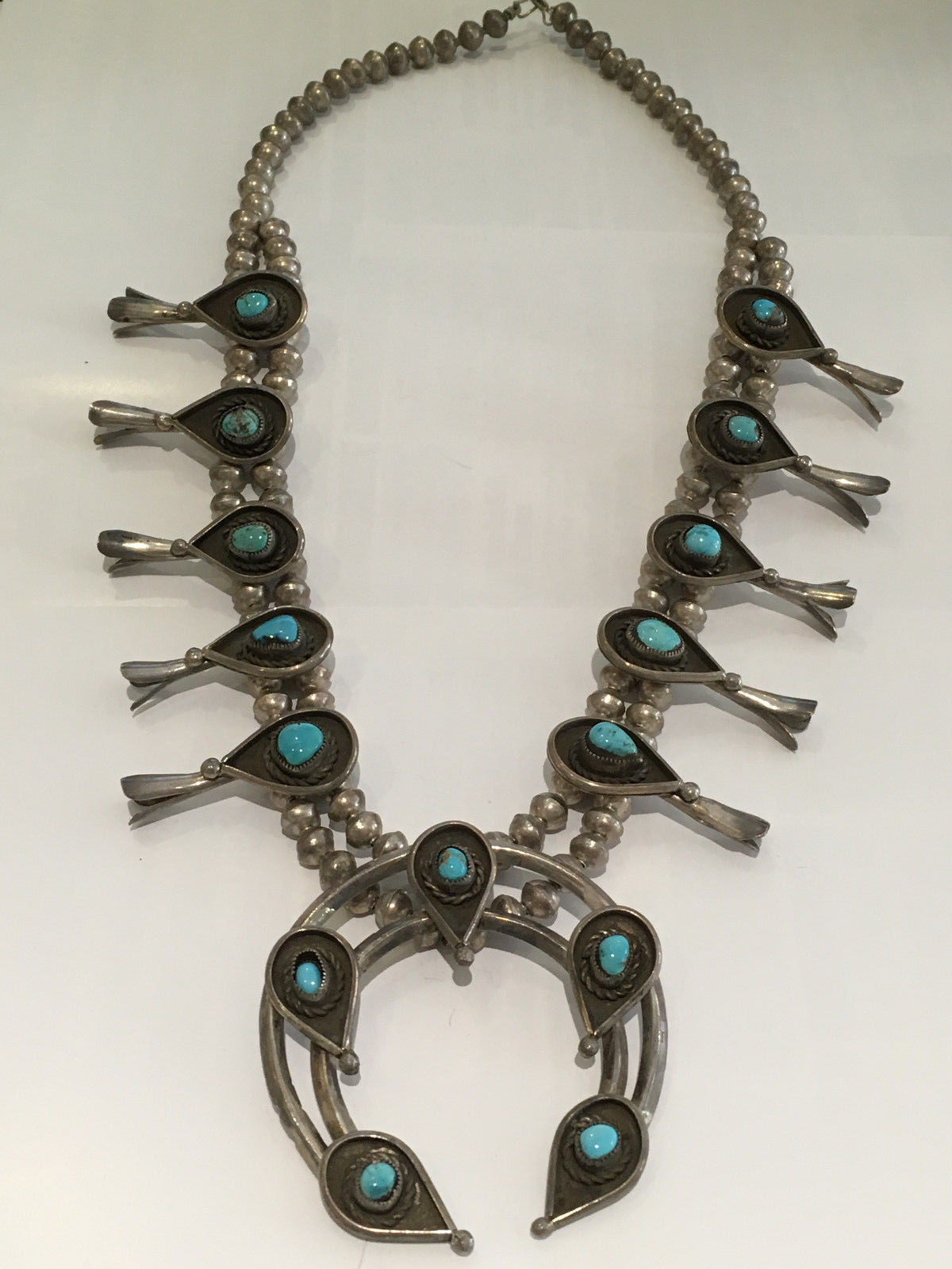 Antique Sterling Silver Turquoise Squash Blossom Necklace Tear Drop – 24″ Length